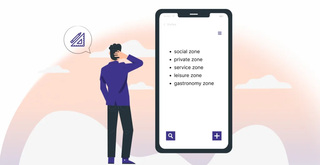 Basically, you categorize the spaces according to their use and privacy: social sector, private sector, service sector, and so on, depending on the type of project.