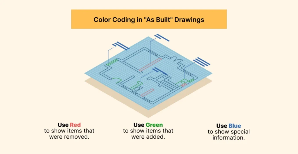 2. Color code: “as-built” drawings follow a standard legend — red for excluded items, green for added items, and blue for special information.