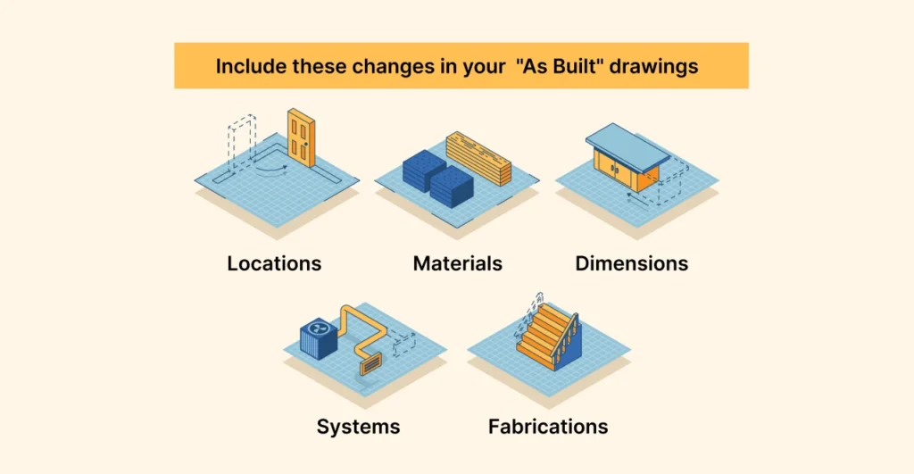 To make sure your “As Built” drawings fully complete and functional, it is essential to record all changes made relative to the original project in the following areas: