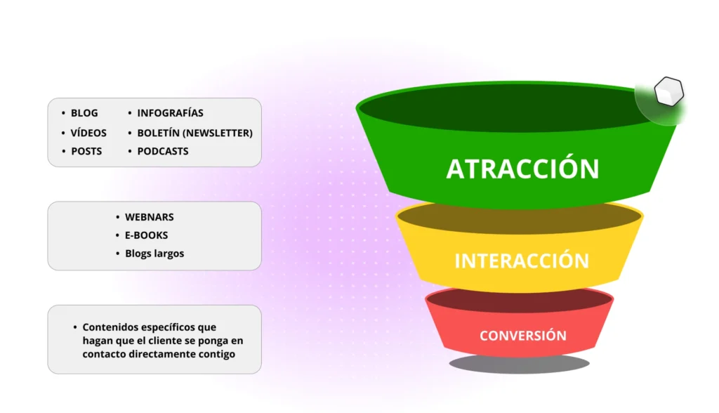 - En la parte inferior del embudo (decisión) están los potenciales clientes listos para tener un contacto directo contigo y contratar tus servicios.