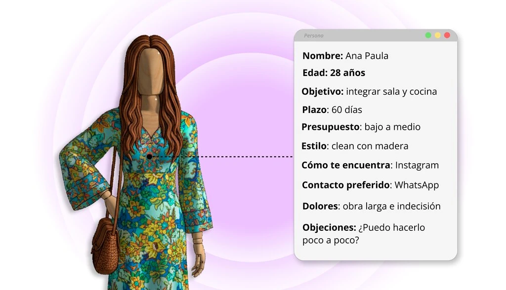 Piensa en detalles como edad, profesión, estilo de vida, gustos, miedos y necesidades de esa persona. Por ejemplo: podría ser “Ana, 28 años, recién casada, busca decorar su primer apartamento con un presupuesto limitado”.