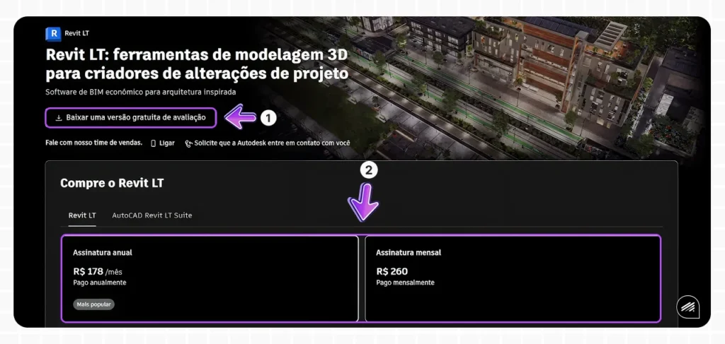 No site de produtos da Autodesk Brasil, o Revit LT aparece com o preço anual de R$ 2.130/ano, com assinatura mensal de R$ 178. É cobrado o valor cheio no cartão de crédito.