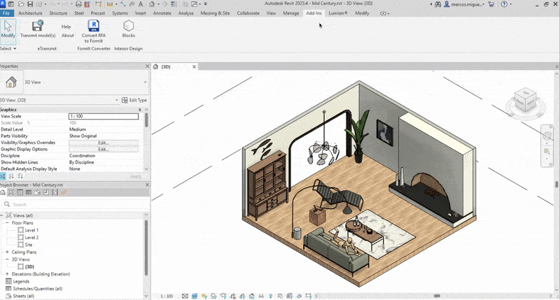 Para quem projeta interiores, existem alguns plug-ins chaves, como: Plugin Blocks, Lumion LiveSync, Enscape ou Twinmotion